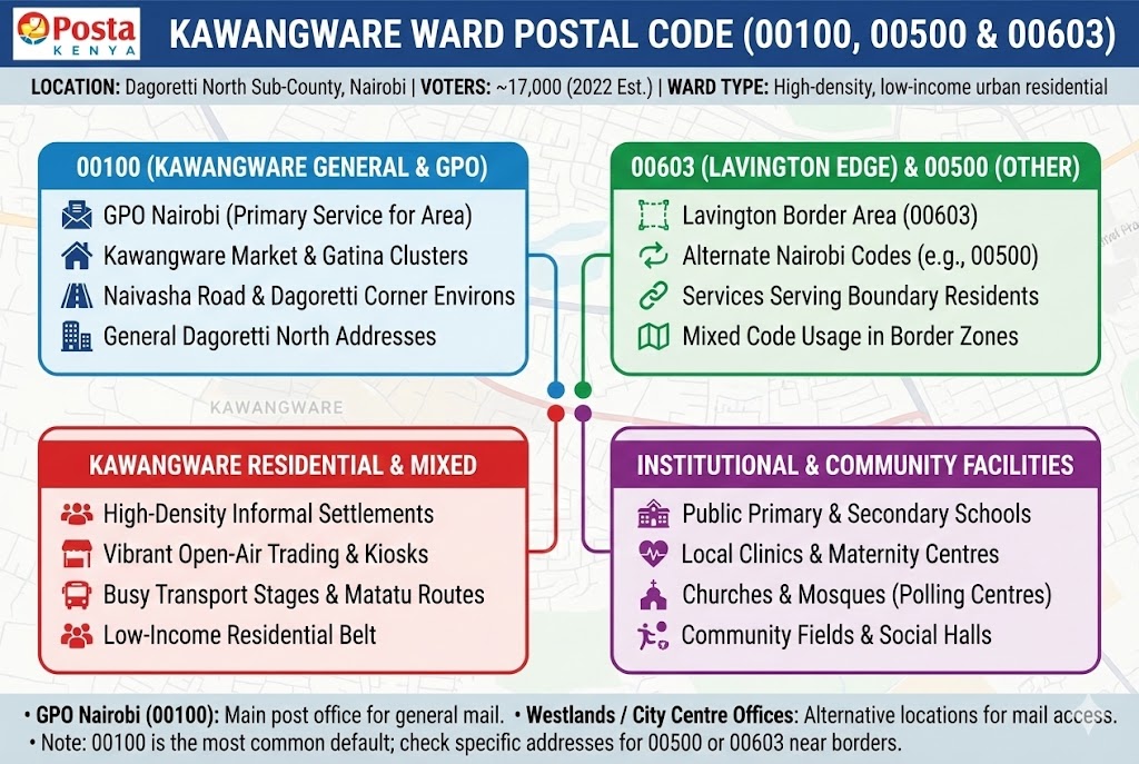 Kawangware uses the general Nairobi code 00100 as its safest primary postal code because many businesses, institutions and directories in the Dagoretti area, including Dagoretti Corner and Naivasha Road addresses, reference 00100 linked to Nairobi GPO rather than a unique local code.​