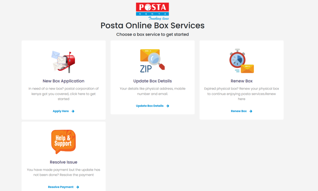 - Go to posta.co.ke on your browser. Look for “Online Services” in the middle section with blue icons. Click it, then select “Box Services“. You’ll see three options: click “Apply Here” under “New Box Application
