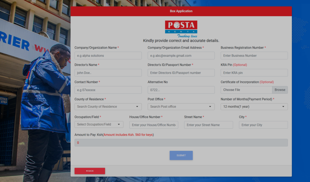 All Postal Box Applications in Kenya, including for Taita Taveta Postal offices, are done via the Posta Kenya Application Portal at: https://apps.posta.co.ke/boxupdate/